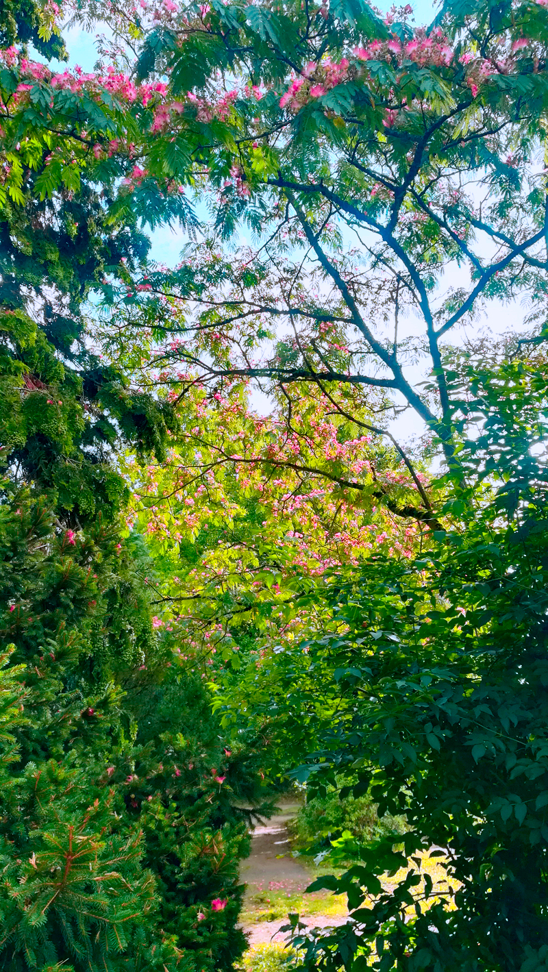 Je me suis envolée sur l'Albizia julibrissin, cet arbre à soie si fleuri et rose, afin de passer mes premières nuits, chassée par deux grandes pies, prise au piège. Ainsi ai-je découvert que ce fut un italien botaniste, Filippo Albizzi qui ramena de Constantinople les graines de cet arbre. Il ressemble au genre des Acacias et des Mimosas. Ma tutrice humaine connait bien les acacias, sa mère elle-même aime chiper des graines et faire des expériences, cultiver la surprise. L'été cet arbre est orientaliste, il a une valeur ornementale par la couleur rose de ses étamines. On se sert de son bois jaune et marbré en menuiserie. D'une forte odeur d’ail à la coupe, cela ne m'a pas dérangé. Les fleurs sont toniques et digestives, elles ressemblent à de petits pinceaux roses disposées en parasol sur les cimes. Heureusement qu'il était là, pour un atterrissage impromptu.
