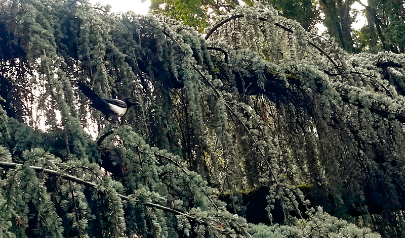 Ce matin il bruine. Puis peu à peu la pluie décida d'y aller plus franchement. Pas un seul oiseau, pas une âme au jardin. La voici qui arrive de bonne heure, elle n'est pas protégée. Je suis perchée sous l'auvent d'un monument historique, elle ne me voit pas. Je vole vers elle et agrippe son panier, quel courage, les jardiniers ne se sont pas levés. Elle trouve un chêne, pose son tapis et le plie en 4, au pied de l'arbre en pente. Il fait froid ce matin. Elle sort son café encore chaud dans son thermos et goulotte un petit peu, moi je crie comme un dératé. "Elle est là, elle est là", que je traduis pour elle, sinon c'est "Kia, kia, kia". Elle sort un peu de viande mais j'en prends un trop gros bout. J'ai les yeux plus gros que le ventre, je veux tout, tout de suite et dans le même temps, jouer, manger, tirer la mousse, voler, chanter, faire ma pie. Quelle excitation cette pluie ! Cela s'apaise, son compagnon arrive avec un grand truc, quelle terrifiante chose, il le pose, et j'alerte toutes les pies du quartier, à la grande surprise de ma tutrice. Je me positionne debout comme un militaire devant la chose inerte et longue, cette espèce de grand fusil noir qui pique, j'alerte toutes les pies. Elles arrivent, mais elles restent prostrées suspendues, au dessus des branches, plus expérimentées que moi. Je suis l'intrépide debout, ma voix porte loin, enfin, je suis la lanceuse d'alerte, je ne m'arrêterai pas tant que vous ne vous débarrassez pas de ce machin. Ils posent le parapluie derrière le chêne, il se trouve puni. Je suis si fière de moi, les pies sont venues voir mon barouf et ont aussi sonné l'alarme : "Tcha cha cha cha cha chak". Je suis de plus en plus intégrée dans un groupe, je tente plusieurs expérience, je motive les troupes, puis je chasse les prédateurs pour les aider. Ma tutrice m'aide pour mon intégration, elle envoie quelques victuailles aux envieuses, et ainsi je picore avec elles. Une femelle m'a repérée, elle vient se poser sur un arbre au-dessus de ma tutrice, puis, elle attend très patiemment. Parfois je ne suis pas là, qu'elle est déjà posée la première. Elle devient sa complice. Mais voici le mâle, quelle assurance, son bec est plus long, sa queue également, il bombe le torse, est très impatient, vient en retard juste pour piquer ce que la femelle a réussi à chiper par sa persévérance. Lui, il arrive en piqué et récolte la mise en un éclair. J'ai bien vu son cinéma. Alors je me suis mise à voler vers lui, tenter de lui tirer la queue. Il n'a pas apprécié du tout et m'a coursée. Puis il s'est posé en équilibre sur une canisse en bambou. J'avais eu l'opportunité de tester l'assise, ma tutrice quelques jours auparavant m'avait posé sur celle-ci, je n'y arrivais pas au début, puis je me suis tenue droite. Là devant le mâle, je lui montre que moi aussi, du haut de mes 2 mois, je triche un peu, je sais faire comme lui. Il pique la canisse comme s'il voulait la détruire, je me place juste à côté et je l'imite. Je suis si fière. Puis il s'envole et je le suis. Ce jour là, j'ai disparu un bon bout de temps. Puis un matin j'arrive avec la femelle pie, deux vols majestueux, je me pose sur l'épaule de ma tutrice comme si elle m’appartenait, la femelle pie se pose sur la branche en face d'elle. Le mâle n'est pas encore là, vite ouvre ta boîte à secrets ! Ne bouge pas, je reviens vite, reste avec mon amie la pie, je vais sécuriser le territoire. Un autre jour j'emmène ma tutrice dans un coin que j'ai découvert, exotique. Je lui montre où je planque mes trucs. Elle découvre une sorte d'insecte assez imposant, un papillon de nuit ou un autre insecte avec un corps assez long, il est mort, je le pique comme si j'allais en faire un barbecue, des brochettes, puis je joue avec un moment. Lorsqu'il a plu, c'est absolument divin. Tout me dynamise, je courre avec mes deux pattes comme à un mariage, celui de la terre qui révèle un nombre insoupçonné d'invités. Je pioche partout. Je reviens montrer mes trouvailles à ma tutrice, mais je perçois que nous ne sommes pas pareil. Quand est-ce qu'elle va piocher avec moi, avec son grand nez, ce n'est pas compliqué bon sang de bonsoir ! Nom d'une pie !