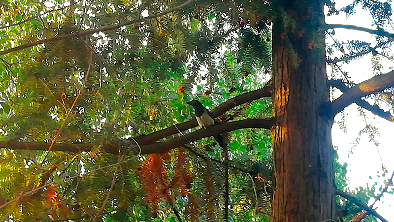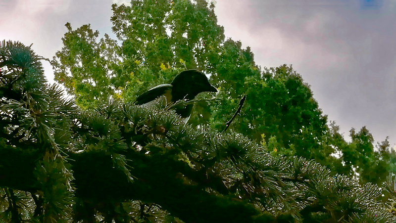 Ce matin il bruine. Puis peu à peu la pluie décida d'y aller plus franchement. Pas un seul oiseau, pas une âme au jardin. La voici qui arrive de bonne heure, elle n'est pas protégée. Je suis perchée sous l'auvent d'un monument historique, elle ne me voit pas. Je vole vers elle et agrippe son panier, quel courage, les jardiniers ne se sont pas levés. Elle trouve un chêne, pose son tapis et le plie en 4, au pied de l'arbre en pente. Il fait froid ce matin. Elle sort son café encore chaud dans son thermos et goulotte un petit peu, moi je crie comme un dératé. "Elle est là, elle est là", que je traduis pour elle, sinon c'est "Kia, kia, kia". Elle sort un peu de viande mais j'en prends un trop gros bout. J'ai les yeux plus gros que le ventre, je veux tout, tout de suite et dans le même temps, jouer, manger, tirer la mousse, voler, chanter, faire ma pie. Quelle excitation cette pluie ! Cela s'apaise, son compagnon arrive avec un grand truc, quelle terrifiante chose, il le pose, et j'alerte toutes les pies du quartier, à la grande surprise de ma tutrice. Je me positionne debout comme un militaire devant la chose inerte et longue, cette espèce de grand fusil noir qui pique, j'alerte toutes les pies. Elles arrivent, mais elles restent prostrées suspendues, au dessus des branches, plus expérimentées que moi. Je suis l'intrépide debout, ma voix porte loin, enfin, je suis la lanceuse d'alerte, je ne m'arrêterai pas tant que vous ne vous débarrassez pas de ce machin. Ils posent le parapluie derrière le chêne, il se trouve puni. Je suis si fière de moi, les pies sont venues voir mon barouf et ont aussi sonné l'alarme : "Tcha cha cha cha cha chak". Je suis de plus en plus intégrée dans un groupe, je tente plusieurs expérience, je motive les troupes, puis je chasse les prédateurs pour les aider. Ma tutrice m'aide pour mon intégration, elle envoie quelques victuailles aux envieuses, et ainsi je picore avec elles. Une femelle m'a repérée, elle vient se poser sur un arbre au-dessus de ma tutrice, puis, elle attend très patiemment. Parfois je ne suis pas là, qu'elle est déjà posée la première. Elle devient sa complice. Mais voici le mâle, quelle assurance, son bec est plus long, sa queue également, il bombe le torse, est très impatient, vient en retard juste pour piquer ce que la femelle a réussi à chiper par sa persévérance. Lui, il arrive en piqué et récolte la mise en un éclair. J'ai bien vu son cinéma. Alors je me suis mise à voler vers lui, tenter de lui tirer la queue. Il n'a pas apprécié du tout et m'a coursée. Puis il s'est posé en équilibre sur une canisse en bambou. J'avais eu l'opportunité de tester l'assise, ma tutrice quelques jours auparavant m'avait posé sur celle-ci, je n'y arrivais pas au début, puis je me suis tenue droite. Là devant le mâle, je lui montre que moi aussi, du haut de mes 2 mois, je triche un peu, je sais faire comme lui. Il pique la canisse comme s'il voulait la détruire, je me place juste à côté et je l'imite. Je suis si fière. Puis il s'envole et je le suis. Ce jour là, j'ai disparu un bon bout de temps. Puis un matin j'arrive avec la femelle pie, deux vols majestueux, je me pose sur l'épaule de ma tutrice comme si elle m’appartenait, la femelle pie se pose sur la branche en face d'elle. Le mâle n'est pas encore là, vite ouvre ta boîte à secrets ! Ne bouge pas, je reviens vite, reste avec mon amie la pie, je vais sécuriser le territoire. Un autre jour j'emmène ma tutrice dans un coin que j'ai découvert, exotique. Je lui montre où je planque mes trucs. Elle découvre une sorte d'insecte assez imposant, un papillon de nuit ou un autre insecte avec un corps assez long, il est mort, je le pique comme si j'allais en faire un barbecue, des brochettes, puis je joue avec un moment. Lorsqu'il a plu, c'est absolument divin. Tout me dynamise, je courre avec mes deux pattes comme à un mariage, celui de la terre qui révèle un nombre insoupçonné d'invités. Je pioche partout. Je reviens montrer mes trouvailles à ma tutrice, mais je perçois que nous ne sommes pas pareil. Quand est-ce qu'elle va piocher avec moi, avec son grand nez, ce n'est pas compliqué bon sang de bonsoir ! Nom d'une pie !