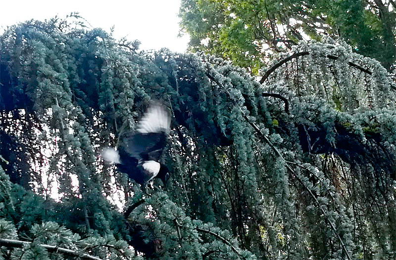 Le soleil se lève, il fait encore frais, je vaque à mes occupations et elles sont multiples. Ma découverte du nouveau jardin, avec des arbres et buissons différents, des fleurs et des légumes, c'est très bien rangé. Il y a plusieurs autres pies aguerries, elles savent où se nourrir. Je n'ai pas eu de parents pour m'apprendre, je suis dans une imitation approximative. Je passe beaucoup de temps à cacher de menues choses que j'estime importantes à mes yeux, mais elles ne s'avèrent pas nourrissantes. Je sais que ma tutrice veille au grain, elle connait l’imprégnation et les conséquences, j'ai pour l'instant une attitude mi-imprégnée par l'être humain, mi-sauvage, j'aime bien avoir ce truc en plus. Je ne sais pas assez que notre complicité, avec ma tutrice fait des envieux. Nous avons eu une désagréable expérience. De jeunes enfants d'êtres humains qui s'ennuyaient âgés d'une dizaine d'années ou une quinzaine, sont venus nous harceler sur plusieurs jours. Ils voulaient me toucher et ont insulté ma tutrice et son compagnon. Ils m'ont protégé. Ils pensaient que ce serait d'autres oiseaux, ou les chats qui seraient mes principaux prédateurs, mais ce sont bien les êtres humains, en particuliers les adolescents. Ils sont peu éduqués et indifférents aux animaux, aux choses de la nature. Et, ils sont très envieux de cette filiation entre un être humain et un animal, que celui-ci soit dans la nature. Ils pensent d'un coup que je pourrai leurs appartenir. Ils sont aussi jaloux de l'amour qui co-existe. Dans ce pays, la violence est encouragée, partout. Elle est montrée comme modèle d'émancipation, de protestation, de manifestation, d'existence. Dans ma réalité, ce sont nos jardins qui sont piétinés, les arbres coupés, les êtres humains ne nous voient pas, ils nous insultent souvent et nous méprisent.