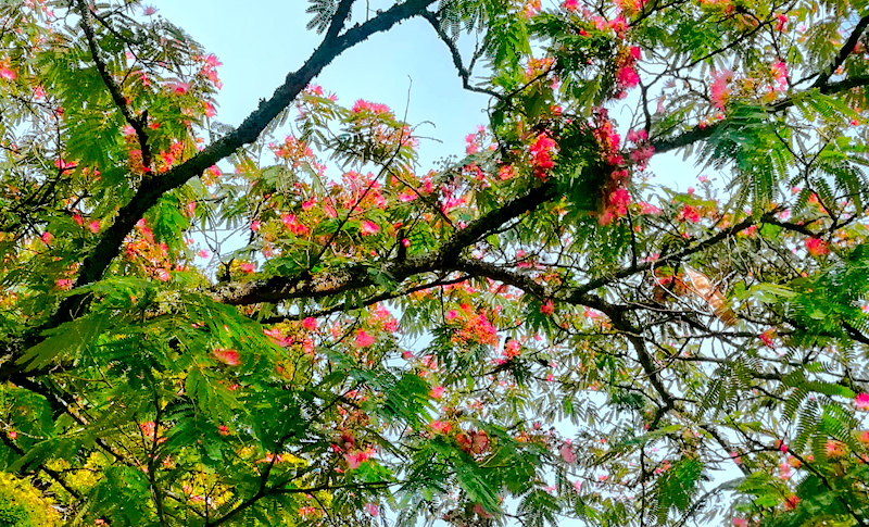 Je me suis envolée sur l'Albizia julibrissin, cet arbre à soie si fleuri et rose, afin de passer mes premières nuits, chassée par deux grandes pies, prise au piège. Ainsi ai-je découvert que ce fut un italien botaniste, Filippo Albizzi qui ramena de Constantinople les graines de cet arbre. Il ressemble au genre des Acacias et des Mimosas. Ma tutrice humaine connait bien les acacias, sa mère elle-même aime chiper des graines et faire des expériences, cultiver la surprise. L'été cet arbre est orientaliste, il a une valeur ornementale par la couleur rose de ses étamines. On se sert de son bois jaune et marbré en menuiserie. D'une forte odeur d’ail à la coupe, cela ne m'a pas dérangé. Les fleurs sont toniques et digestives, elles ressemblent à de petits pinceaux roses disposées en parasol sur les cimes. Heureusement qu'il était là, pour un atterrissage impromptu.